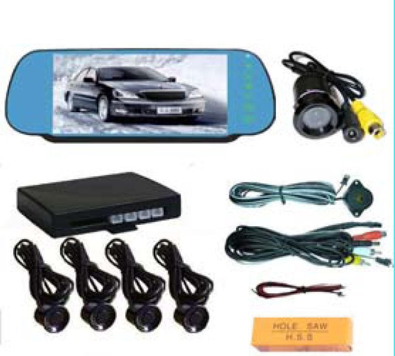 Το σετ περιλαμβάνει : 7 ιντσών έγχρωμη οθόνη TFT στον καθρέφτη , 4 αισθητήρες , κάμερα με νυχτερινή λειτουργία , καλώδια , οδηγίες εγκατάστασης.